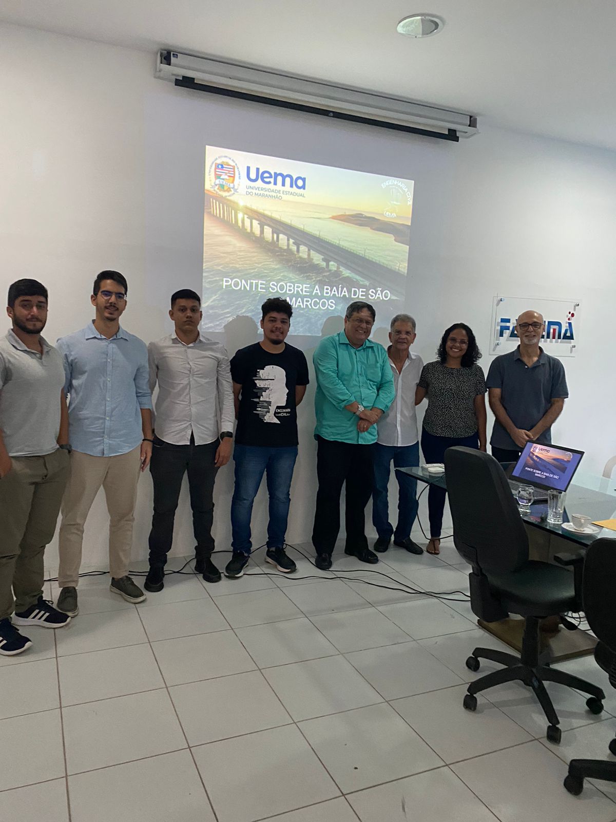 Representantes do curso de Engenharia Civil da Universidade Estadual do Maranhão (Uema) realizaram uma apresentação sobre um projeto de extensão do curso relacionado à ponte sobre a Baía de São Marcos. A apresentação foi realizada diretamente ao Presidente da Fapema, profº. Nordmam Wall.