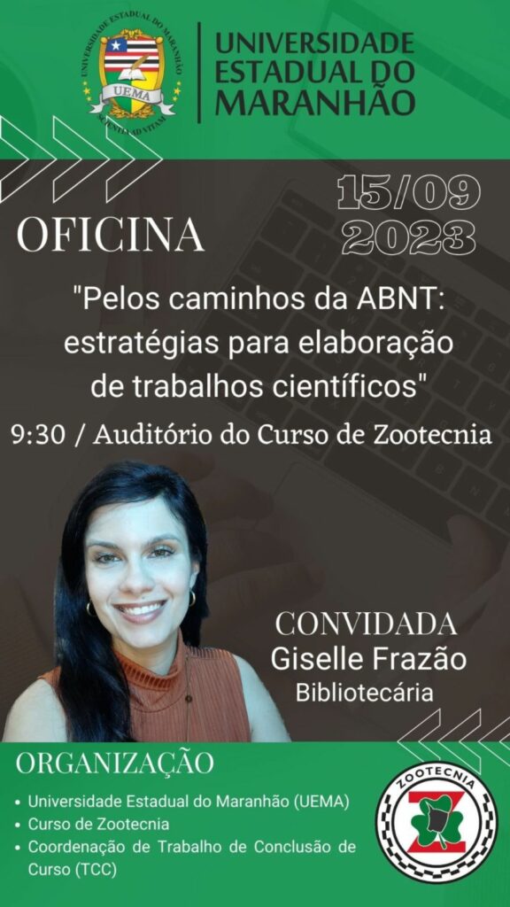 A Universidade Estadual do Maranhão (Uema), por meio da coordenação de TCC do curso de Zootecnia, promoverá no dia 15 de setembro (sexta-feira), às 09h30, no auditório do curso de Zootecnia, uma oficina com o tema “Pelos caminhos da ABNT: estratégias para elaboração de trabalhos científicos”, ministrada pela Bibliotecária (lotada na Biblioteca Central da Uema), Gisele Frazão.