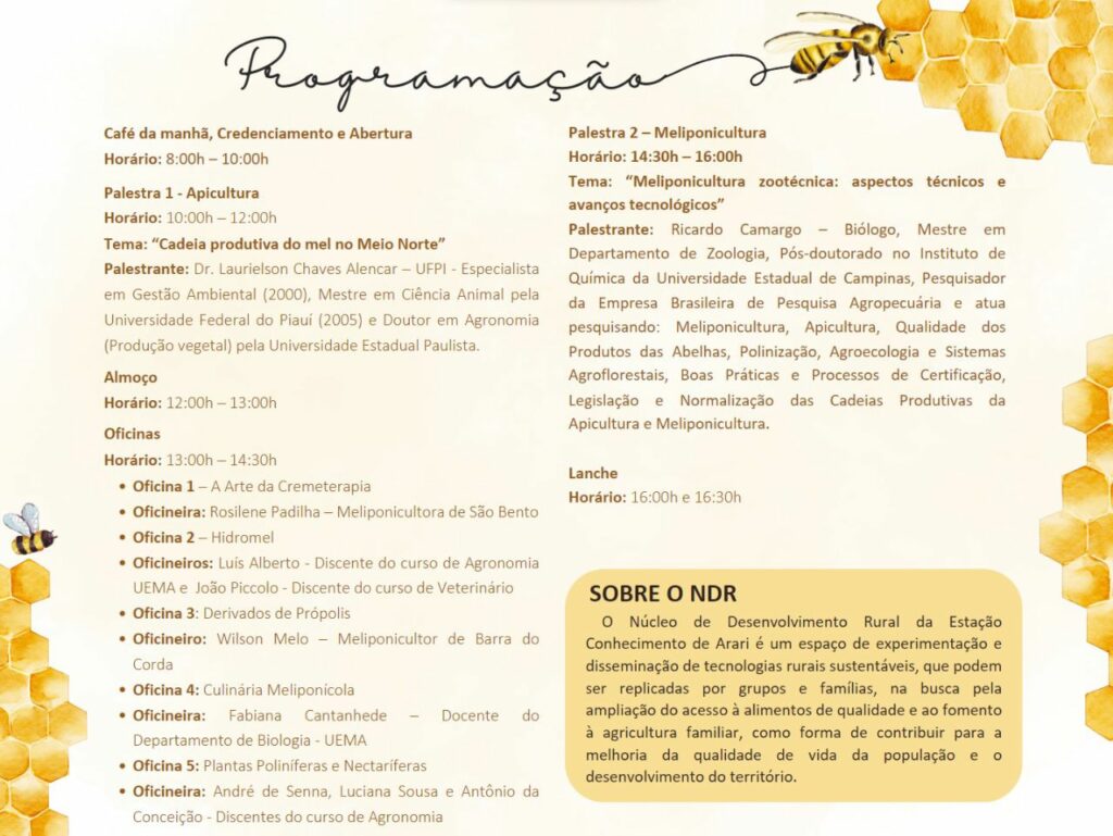 O evento, que acontecerá na Estação Conhecimento em Arari, contará com palestras e oficinas ofertando mais conhecimento e mais inovações para quem vive do mel do Maranhão.