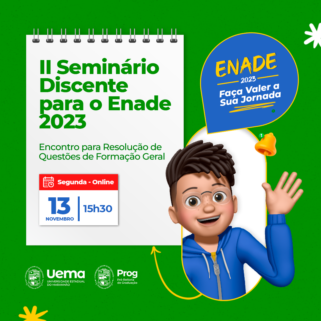 A Universidade Estadual do Maranhão (Uema), por meio da Divisão de Acompanhamento e Avaliação do Ensino da Pró-reitoria de Graduação (DAE/PROG), realiza nesta segunda-feira (13), às 15h30, o segundo ‘Seminário Discente para o ENADE 2023’, encontro destinado aos alunos concluintes, focado em resoluções de questões de formação geral para a prova do Exame Nacional de Desempenho dos Estudantes 2023.