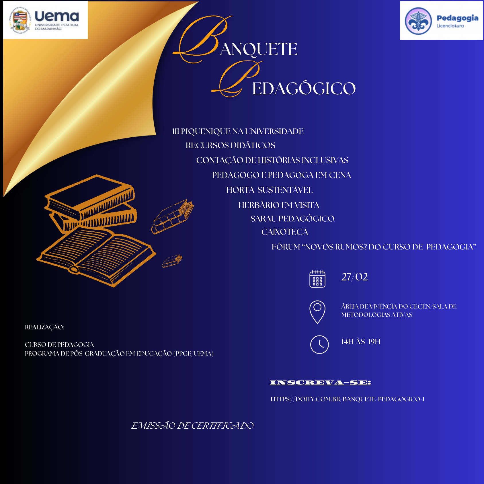 A Universidade Estadual do Maranhão (Uema), através do Curso de Pedagogia, convida a comunidade acadêmica (discentes e docentes) para o I Banquete Pedagógico. O encontro acontecerá no dia 27 de fevereiro, das 14h às 19h, na área de vivência e no Laboratório de Metodologias Ativas do CECEN. O evento visa socializar produtos pedagógicos construídos pelos discentes em algumas disciplinas durante este semestre, proporcionando um banquete de conhecimentos teóricos e práticos.