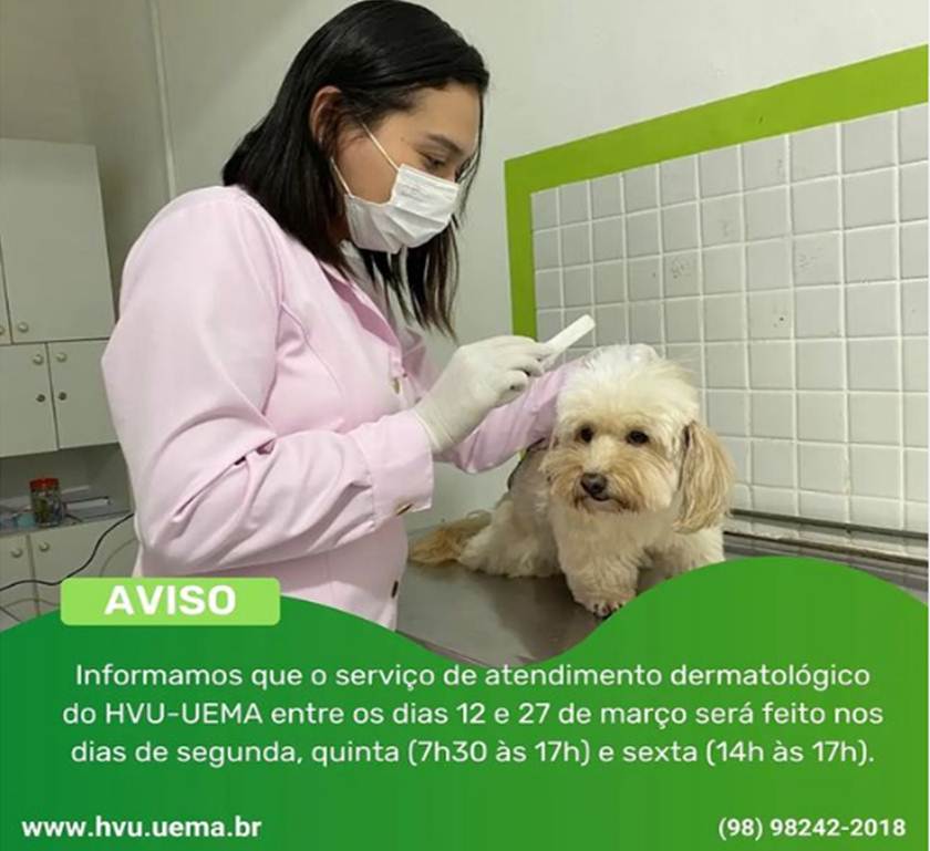 Informamos que o serviço de atendimento dermatológico do Hospital Veterinário da Universidade Estadual do Maranhão (HVU-Uema), dos dias 12 a 27 de março, será feito semanalmente nos dias de segunda (das 7h30 às 17h), quinta (das 7h30 às 17h) e sexta (das 14h às 17h).