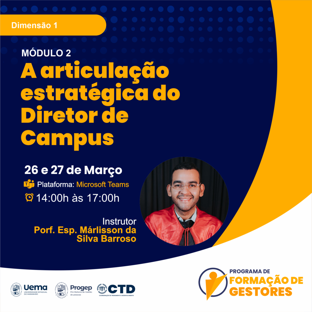 A Universidade Estadual do Maranhão, por meio da Coordenação de Treinamento e Desenvolvimento realizará nos dias 26 e 27 de Março , de forma virtual, o segundo módulo do Programa de Formação de Gestores. A CTD oferta o II módulo intitulado “A articulação estratégica do Diretor de Campus”.