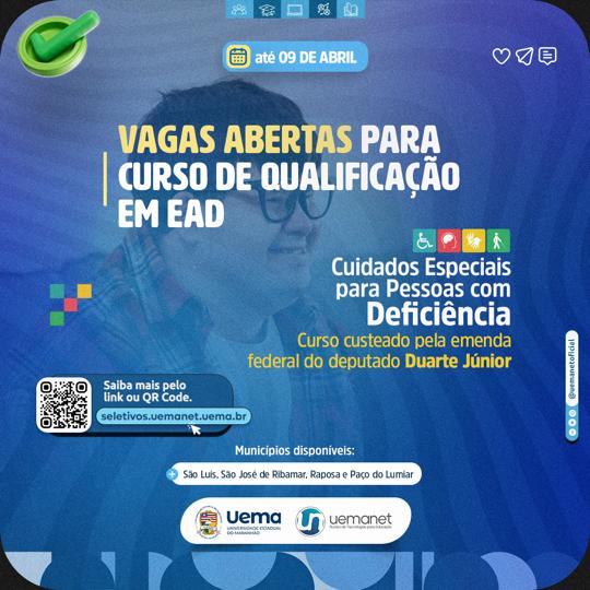O curso de Cuidados Especiais para Pessoas com Deficiência, disponibilizado pelo Núcleo de Tecnologias para Educação (Uemanet), da Universidade Estadual do Maranhão (Uema), está com as inscrições abertas até o dia 09 de abril no site seletivos.uemanet.uema.br.
