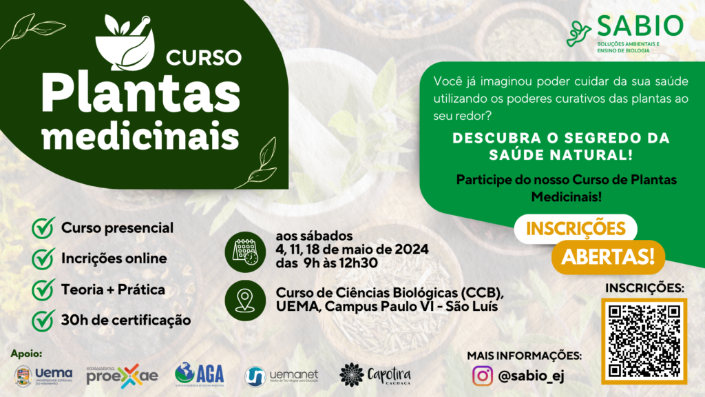 Soluções Ambientais e Ensino de Biologia, Empresa Júnior do curso de Ciências Biológicas da Universidade Estadual do Maranhão (Uema), Campus Paulo VI oferecerá o Curso de Plantas Medicinais. O curso acontecerá de forma presencial, aos sábados, nos dias 4, 11 e 18 de maio de 2024, das 9h às 12h30 no prédio do Curso de Ciências Biológicas (CCB) da Uema, Campus Paulo VI.
