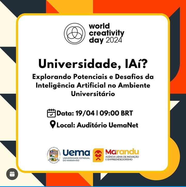 O Dia Mundial da Criatividade é uma celebração anual que visa promover a criatividade e a inovação em todo o mundo. Neste ano, a Universidade Estadual do Maranhão (Uema) por meio da Agência de Inovação e Empreendedorismo – Marandu, estará organizando um evento especial intitulado “UNIVERSIDADE, IAÍ? Explorando Potenciais e Desafios da Inteligência Artificial no Ambiente Acadêmico”.