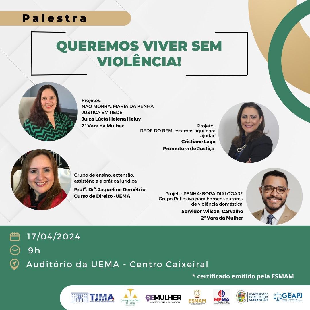 No dia 17 de abril, quarta-feira, a partir das 9h, o auditório da Uema, localizado no Centro Caixeiral, Centro Histórico, será palco da palestra “Queremos viver sem violência”. O evento contará com a apresentação de projetos como Não Morra Maria da Penha, Justiça em Rede e Bora Dialogar, da 2ª Vara da Mulher – TJ MA, bem como o projeto Rede do Bem: Estamos Aqui Para Ajudar, do MP – MA, e iniciativas vinculadas ao GEAPJ sob a orientação da professora Jaqueline Demétrio. Os interessados podem realizar a inscrição por meio do link: https://docs.google.com/forms/d/e/1FAIpQLSfHZKMePr1r5klhxyu1jIO6wBR6VGKEUb28F-nOqVG8BWRb3w/viewform.