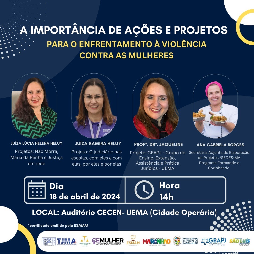 Já no dia 18 de abril, quinta-feira, a partir das 14h, o evento “Importância de Ações e Projetos para o Enfrentamento à Violência contra as Mulheres” acontecerá no auditório do Centro de Educação, Ciências Exatas e Naturais (Cecen) – Campus Paulo VI. Durante este evento, serão apresentados projetos como Não Morra Maria da Penha, Justiça em Rede da 2ª Vara da Mulher – TJ MA, O Judiciário nas Escolas, com Eles e com Elas, por Eles e por Elas, da 3ª Vara de Violência Doméstica TJ- A, além do projeto Formando e Cozinhando da SEDES – MA, e iniciativas vinculadas ao GEAPJ sob a orientação da professora Jaqueline Demétrio. As inscrições podem ser feitas pelo link: https://docs.google.com/forms/d/e/1FAIpQLSe8SfeJM50hs8SactqKFsfqhySk9luZ4RmA1UmWsrm6xfAuqw/viewform.