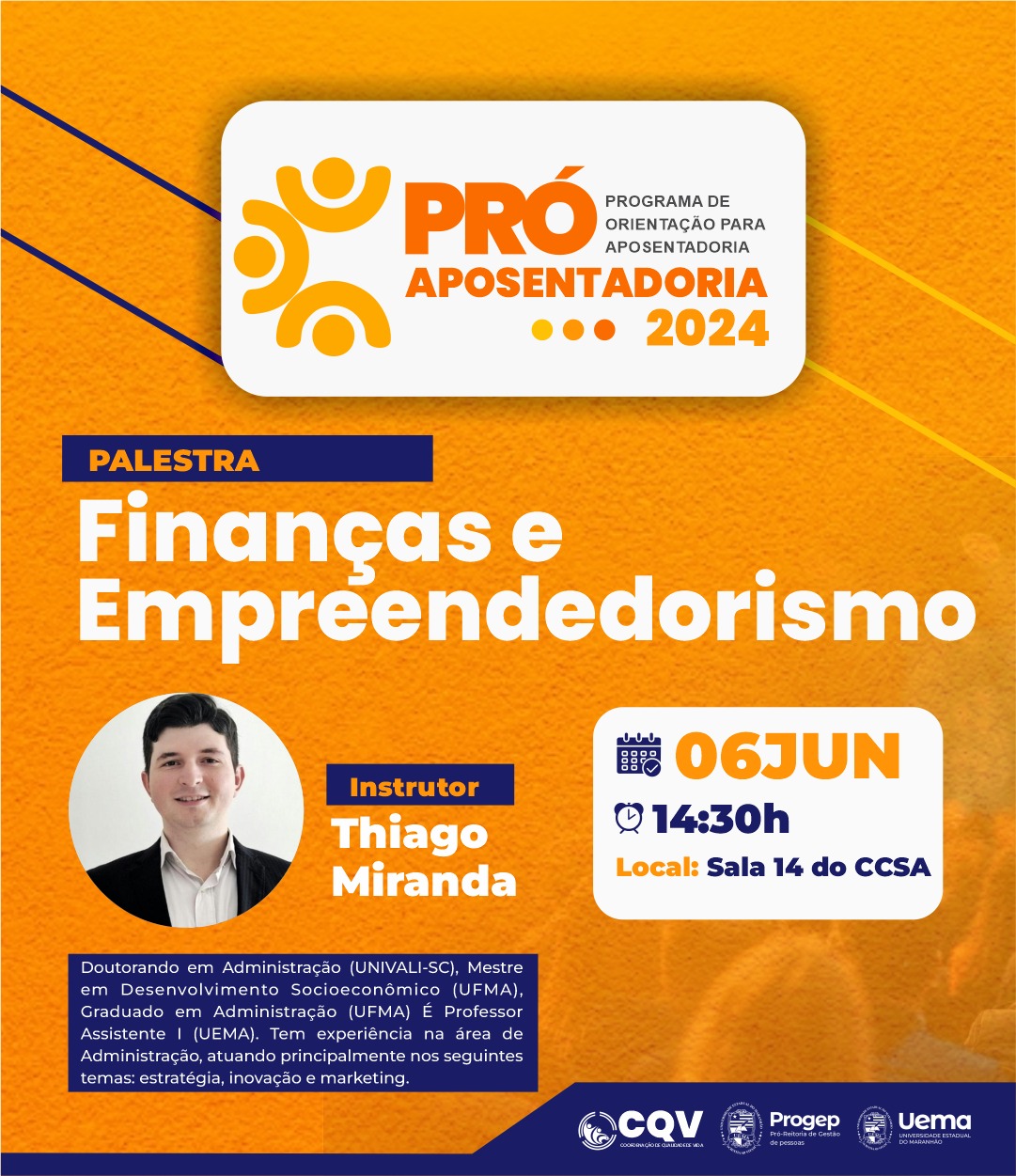 A palestra intitulada “Finanças e Empreendedorismo”, será ministrada pelo mestre em Desenvolvimento Socioeconômico, Thiago Miranda, professor assistente da Uema e experiente na área de administração.