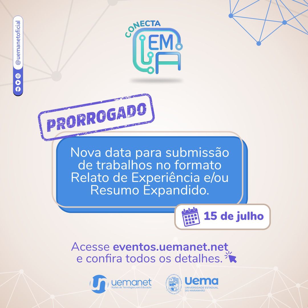 O Conecta Uema 2024, seminário organizado pelo Núcleo de Tecnologias para Educação (Uemanet), estendeu o prazo para submissão de trabalhos no formato de Resumo Expandido e Relato de Experiência até 15 de julho. Para submeter um trabalho, é necessário realizar a inscrição gratuita no evento através do site eventos.uemanet.net, onde os interessados encontrarão as orientações para a elaboração dos trabalhos.
