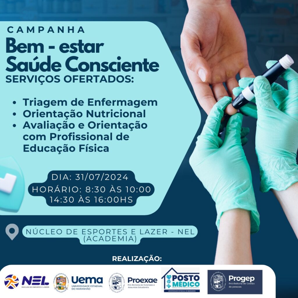 A Universidade Estadual do Maranhão (UEMA), por meio do Núcleo de Esporte e Lazer (Nel) da Pró-Reitoria de Extensão e Assuntos Estudantis (Proexae), realizará nesta quarta-feira (31) a campanha “Bem-estar Saúde Consciente”. Este evento visa proporcionar à comunidade acadêmica e ao público em geral uma série de serviços de saúde e bem-estar, reforçando o compromisso da Uema com a qualidade de vida de seus estudantes e colaboradores.