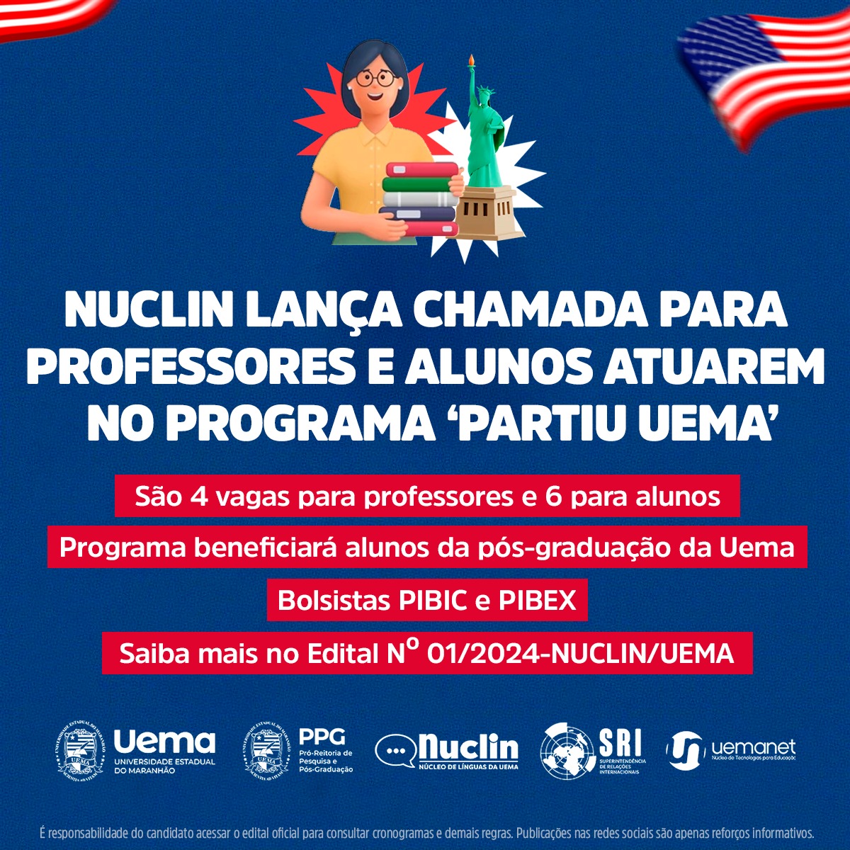A Universidade Estadual do Maranhão (Uema), por meio do Núcleo de Línguas (Nuclin), lançou o edital 01/2024-Nuclin/Uema para seleção de professores supervisores e monitores que atuarão no Programa Partiu Uema. O processo de inscrição, que já está aberto, segue até o dia 1º de outubro de 2024. O edital visa selecionar profissionais e estudantes para o desenvolvimento de atividades ligadas ao ensino de línguas estrangeiras, com o objetivo de fortalecer a internacionalização e a capacitação acadêmica na instituição.