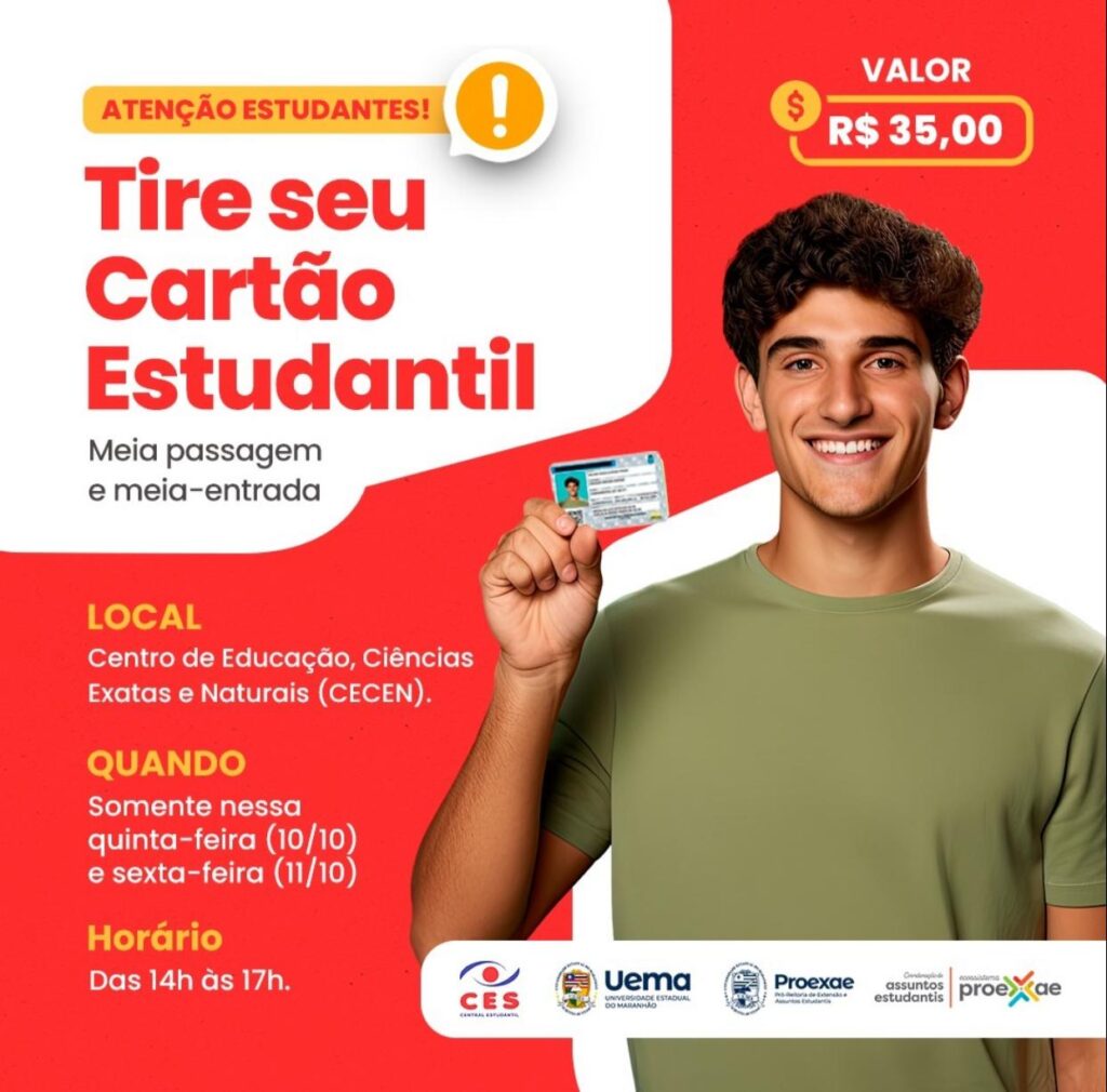 Atenção, estudantes da Universidade Estadual do Maranhão (Uema), Campus Paulo VI, fique atento! Nesta quinta-feira (10/10) e sexta-feira (11/10), será possível emitir o Cartão Estudantil, essencial para garantir o direito à meia passagem e meia-entrada em eventos culturais.