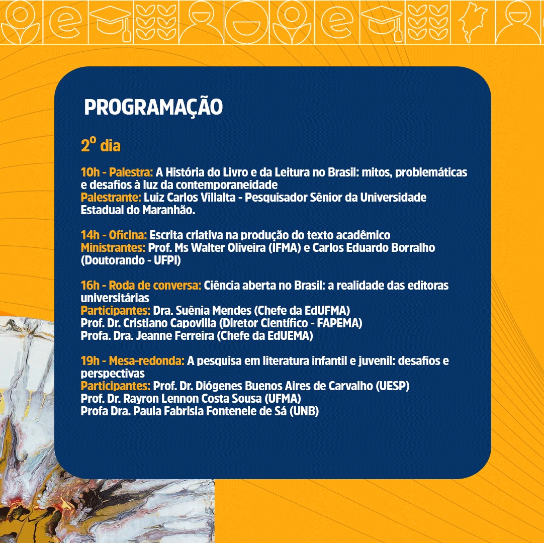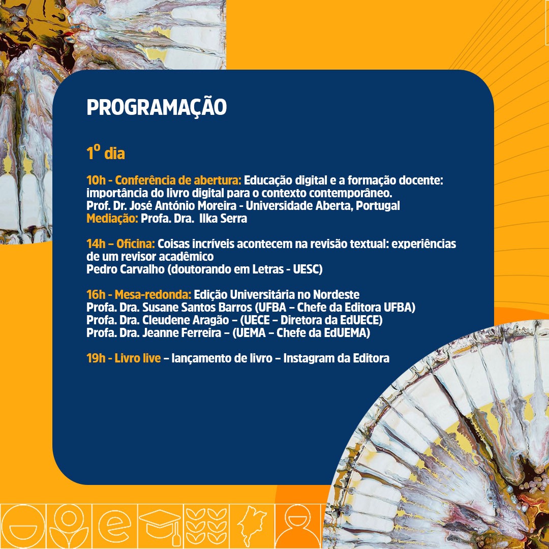 O evento contará com uma programação rica e diversificada, incluindo conferência, oficinas, mesas-redondas, lançamento de livro e rodas de conversa. A conferência de abertura, intitulada “Educação digital e a formação docente: importância do livro digital para o contexto contemporâneo”, será realizada às 10h e contará com a participação do professor Dr. José António Moreira, da Universidade Aberta de Portugal. A mediação será conduzida pela Pró-Reitora de Extensão e Assuntos Estudantis da Uema, Ilka Serra.