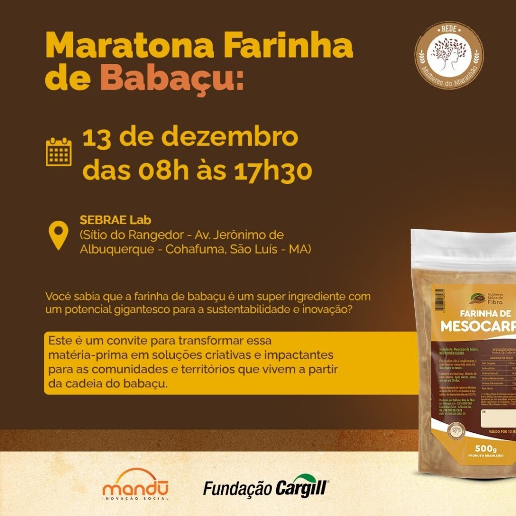 Estudantes da Universidade Estadual do Maranhão (Uema) têm uma oportunidade única de mostrar sua criatividade e contribuir para o desenvolvimento sustentável. No dia 13 de dezembro, acontecerá a Maratona Farinha de Babaçu, evento realizado pela Rede Mulheres do Maranhão e promovido pela Mandū – Inovação Social e Fundação Cargill, voltado para universitários que busca explorar novas ideias e aplicações para a farinha de coco babaçu. O evento será realizado no Sebrae Lab, Sítio do Rangedor – Cohafuma, das 8h às 17h30.