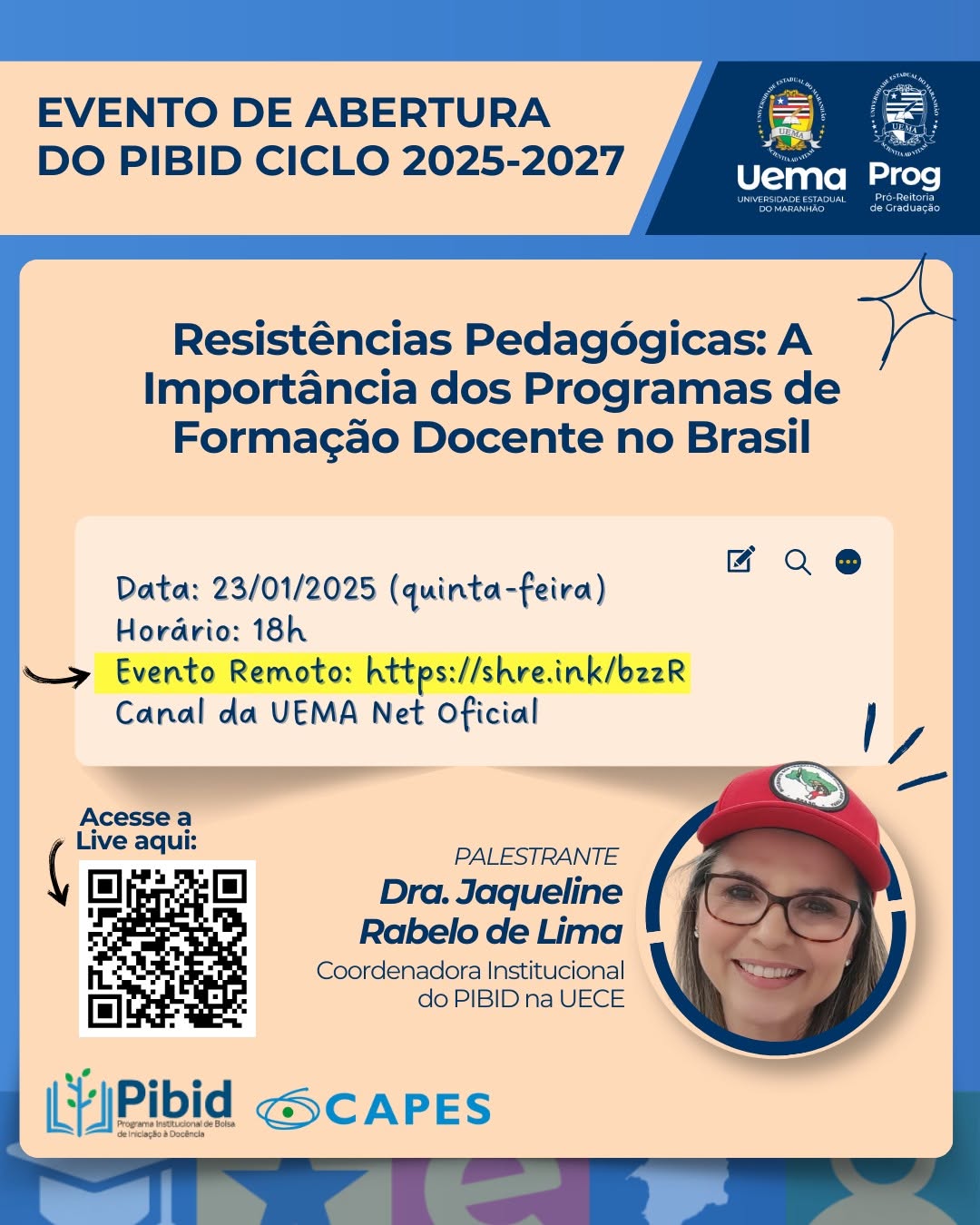 O Programa Institucional de Bolsa de Iniciação à Docência (PIBID/UEMA) convida alunos e docentes dos cursos de licenciatura da Universidade Estadual do Maranhão (UEMA) para a abertura do ciclo 2025-2027, que acontecerá no próximo dia 23 de janeiro. O evento, com tema central sobre a formação de professores no Brasil, será transmitido remotamente, às 18h, pelo Canal UEMANet Oficial.