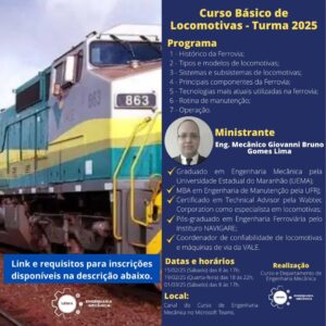 O curso será conduzido pelo Eng. Mecânico Giovanni Bruno Gomes Lima, Coordenador de Confiabilidade de Locomotivas e Máquinas de Via da VALE. As aulas ocorrerão na plataforma Microsoft Teams, proporcionando acesso remoto e flexível para os participantes.