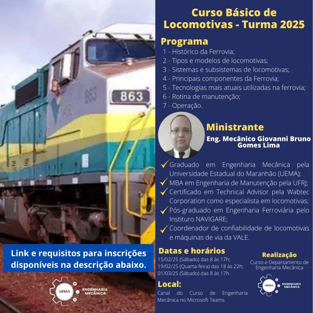 Atenção, discentes do 5º ao 10º período do Curso de Engenharia Mecânica da CCT/UEMA! Está chegando ao fim o prazo para inscrição no Curso Básico de Locomotivas, uma oportunidade exclusiva promovida pelo curso em parceria com o Departamento de Engenharia Mecânica (DEMEC).