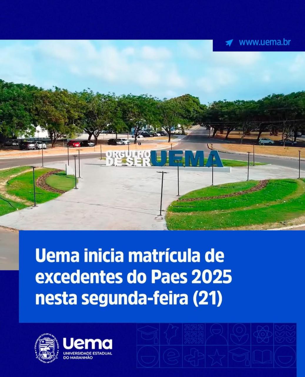 Começa nesta segunda-feira, 21 de julho de 2025, o período de matrículas dos candidatos excedentes convocados pela Universidade Estadual do Maranhão (Uema), para ingresso no segundo semestre letivo de 2025. A convocação segue rigorosamente a ordem decrescente de pontos, conforme a classificação final do Processo Seletivo de Acesso à Educação Superior – PAES 2025, regido pelo Edital nº 68/2024-GR/UEMA.
