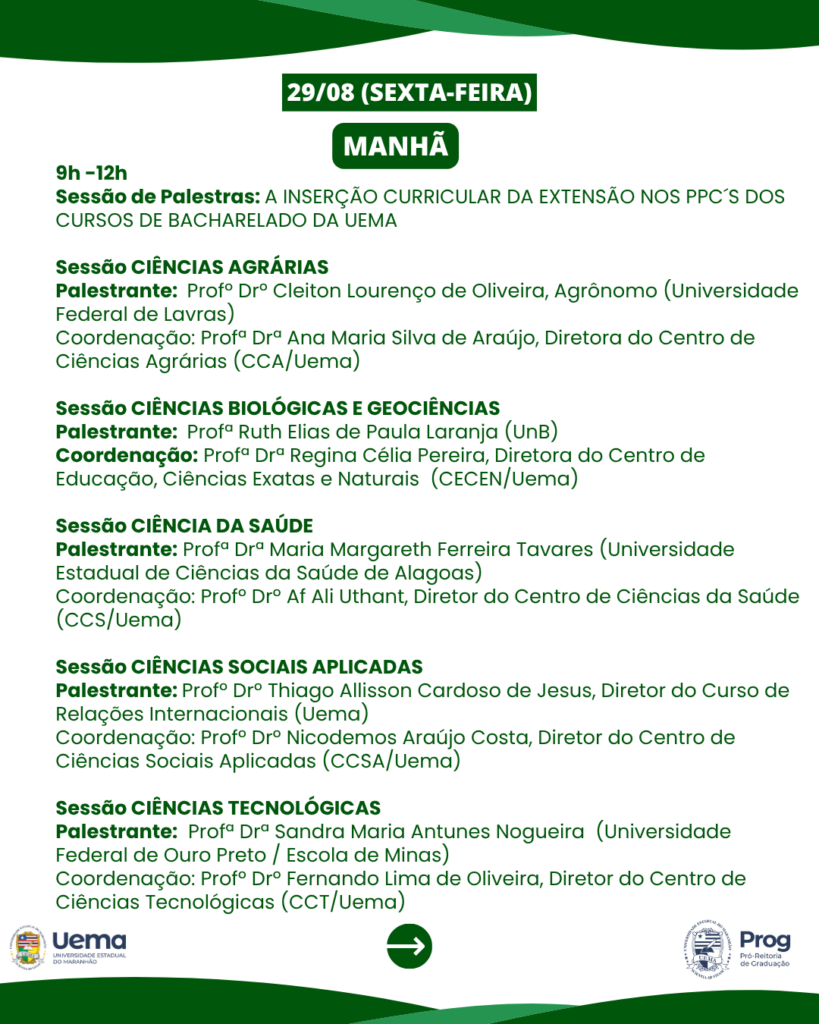 A palestra de abertura será proferida pela professora Ruth Elias de Paula Laranja, da Universidade de Brasília (UnB), com o tema “Curricularização da extensão nos Cursos de Bacharelado: diretrizes, experiências e desafios”.