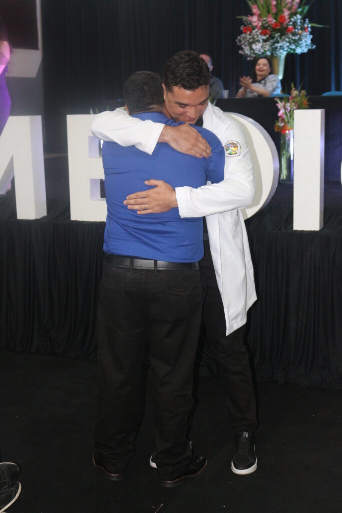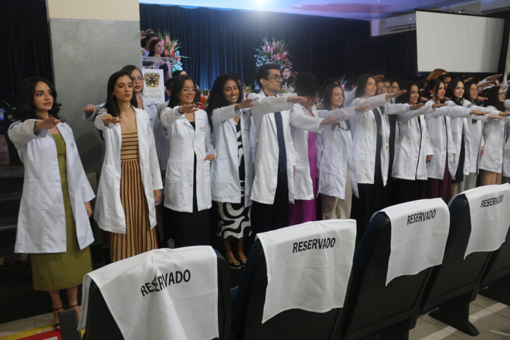 Dando prosseguimento, o veterano Emanuel Goudinho Vieira, da Turma XXII, dirigiu palavras de acolhimento e encorajamento à nova turma: “Hoje não é apenas um dia de cerimônia, é um marco. O jaleco representa, ao mesmo tempo, responsabilidade e privilégio. Ele carrega em cada costura uma promessa silenciosa que diz que vocês estão vestindo algo que vai mostrar a disposição de vocês para aprender, cuidar e, acima de tudo, se doar. A palavra ‘sozinho’ começa a perder o sentido hoje. Sempre haverá alguém disposto a ajudar vocês. Vocês vão construir histórias, amizades e legados para a vida toda. Que hoje seja o primeiro capítulo de uma história extraordinária. Tenham orgulho do que conquistaram”.