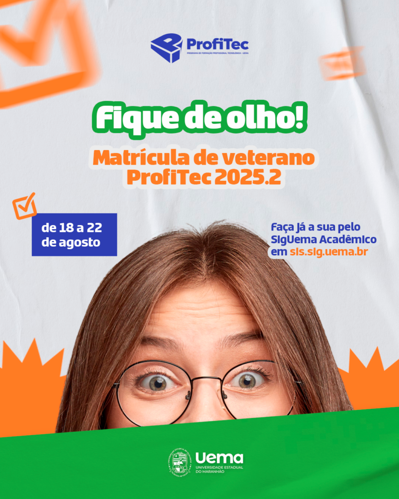 A Universidade Estadual do Maranhão (Uema), por meio do Programa de Formação Profissional Tecnológica (ProfiTec), informa que o período de rematrícula dos estudantes veteranos para o segundo semestre de 2025 será realizado entre os dias 18 e 22 de agosto.