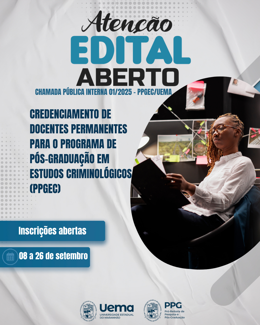 A Universidade Estadual do Maranhão, por meio da Coordenação do Programa de Pós-Graduação em Estudos Criminológicos (PPGEC), divulgou a abertura de inscrições para a Chamada Pública Interna de credenciamento de professores permanentes exclusivos do programa.