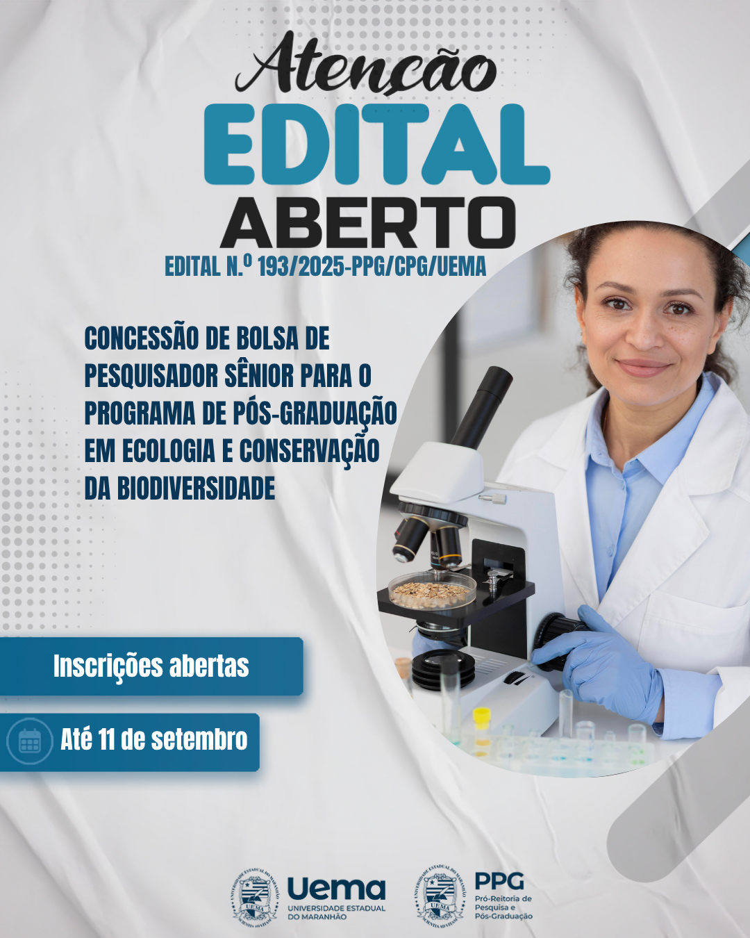 O objetivo é selecionar um profissional para atuar em atividades de pesquisa junto ao Programa de Pós-Graduação em Ecologia e Conservação da Biodiversidade, no âmbito do Programa de Qualidade Total dos Programas de Pós-Graduação da UEMA (PROQUALIT), conforme as Resoluções n.º 1158/2015-CEPE/UEMA, n.º 1452/2021-CEPE/UEMA e n.º 626/2024-CAD/UEMA.