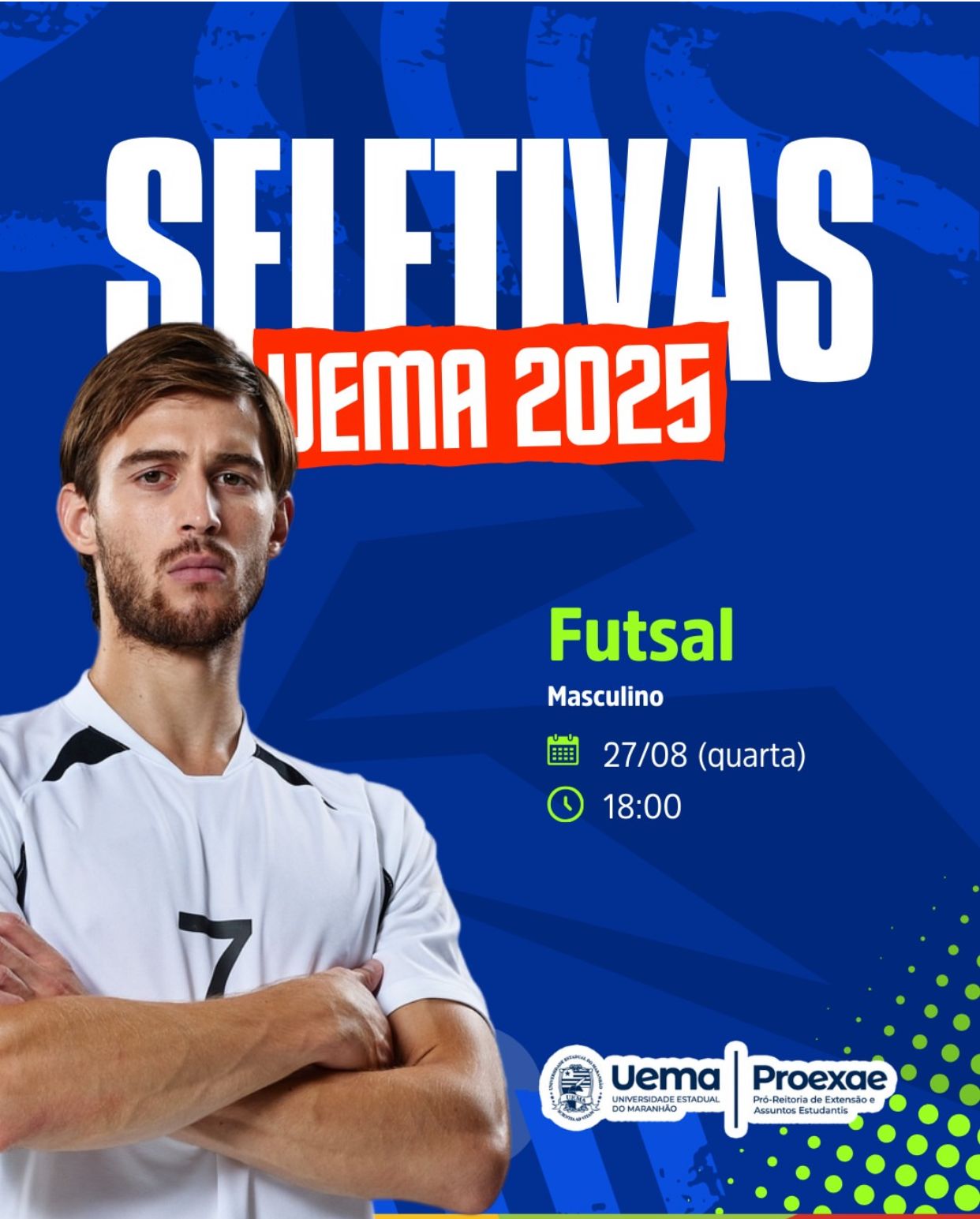 A Universidade Estadual do Maranhão (Uema), por meio da Pró-Reitoria de Extensão e Assuntos Estudantis (Proexae), anuncia a realização das Seletivas Uema 2025 de Futsal Masculino.