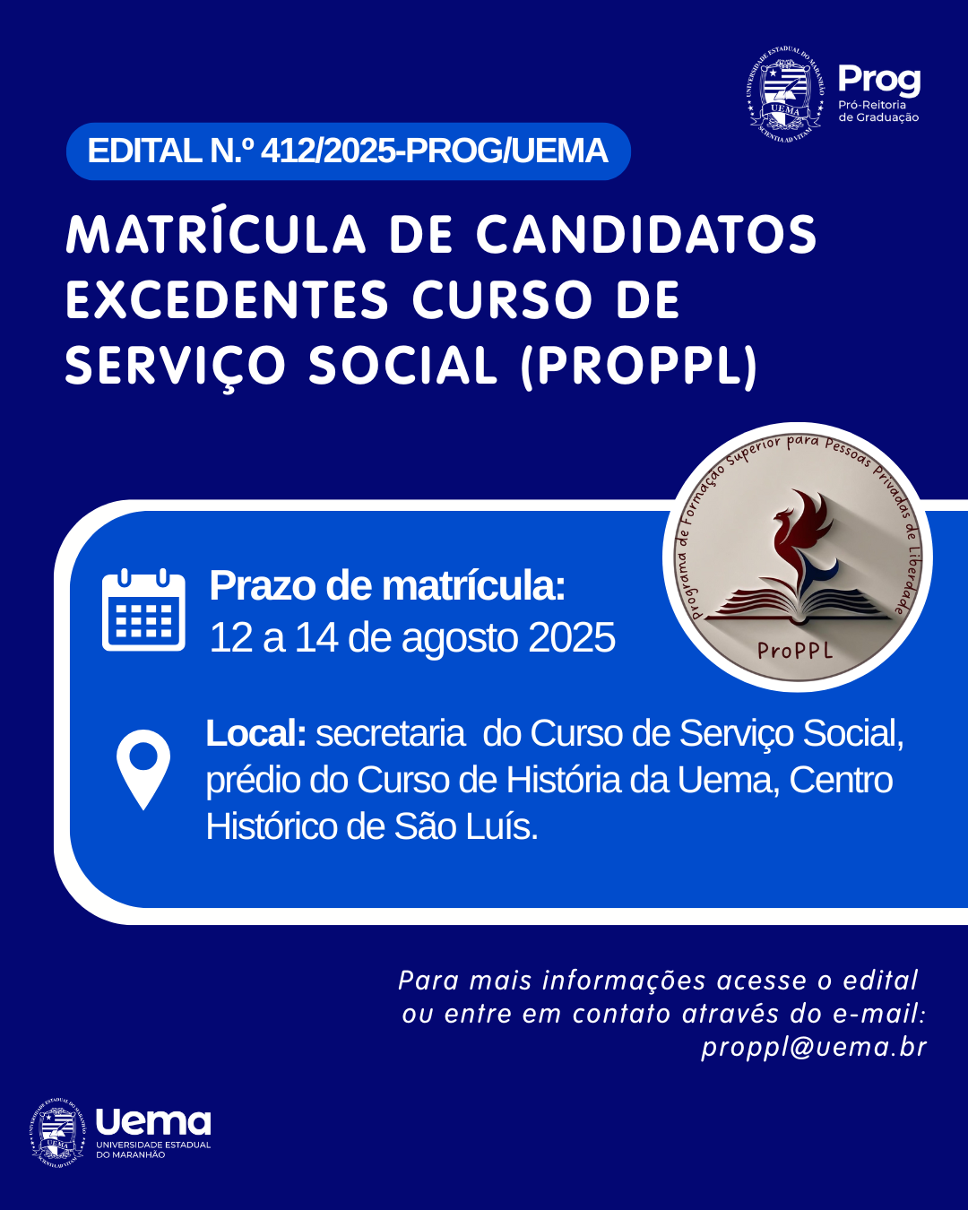 A Universidade Estadual do Maranhão (Uema), por meio da Pró-Reitoria de Graduação (Prog), divulgou a lista dos candidatos excedentes das vagas remanescentes do Processo Seletivo Simplificado do Programa de Formação Superior de Pessoas Privadas de Liberdade (ProPPL), curso de graduação em Serviço Social, para o segundo semestre letivo de 2025.