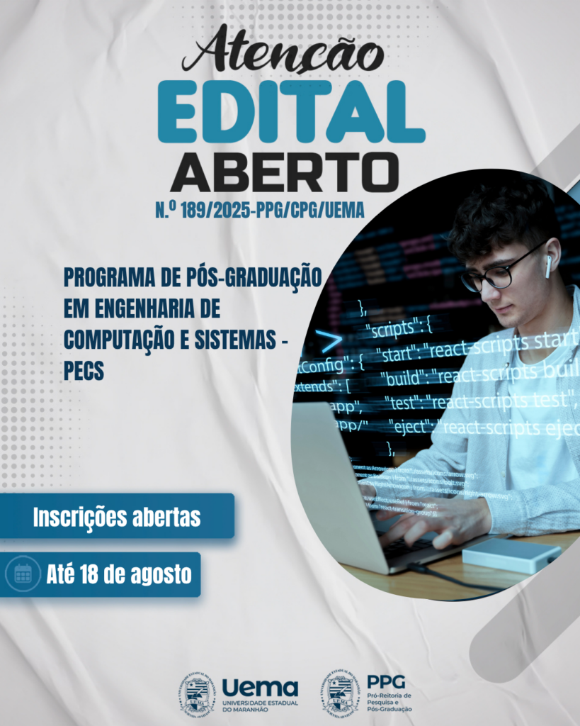 As inscrições devem ser realizadas exclusivamente pela internet até o dia 18 de agosto, no site do Programa de Pós-Graduação em Engenharia da Computação e Sistemas da Uema, na aba “Editais”.