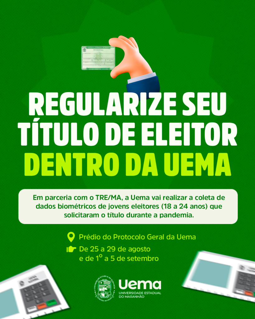 A Universidade Estadual do Maranhão (Uema), por meio do Tribunal Regional Eleitoral do Maranhão (TRE/MA), realizará o Projeto Biometria para a coleta dos dados biométricos de eleitores com idade entre 18 e 24 anos, que devido à pandemia, solicitaram seus títulos eleitorais, mas ainda não efetuaram o cadastramento biométrico.