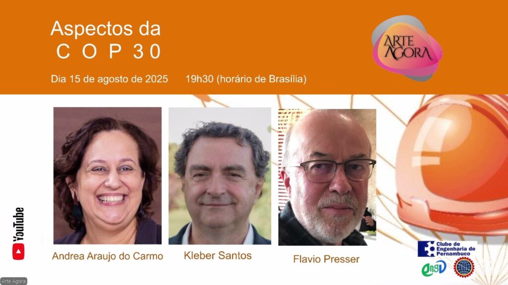O encontro será transmitido ao vivo, nesta sexta-feira (15), às 19h30, pelo canal ‘Arte Agora’, com apoio do Movimento Engenharia pela Democracia, do Clube de Engenharia do Brasil e do Clube de Engenharia de Pernambuco.