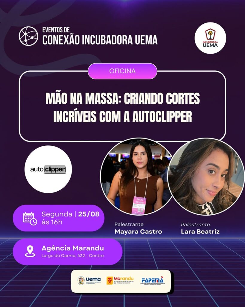 A oficina, promovida pela startup Autoclipper, acontecerá às 16h, na Agência Marandu, e contará com a mediação de Mayara Castro e Lara Beatriz.