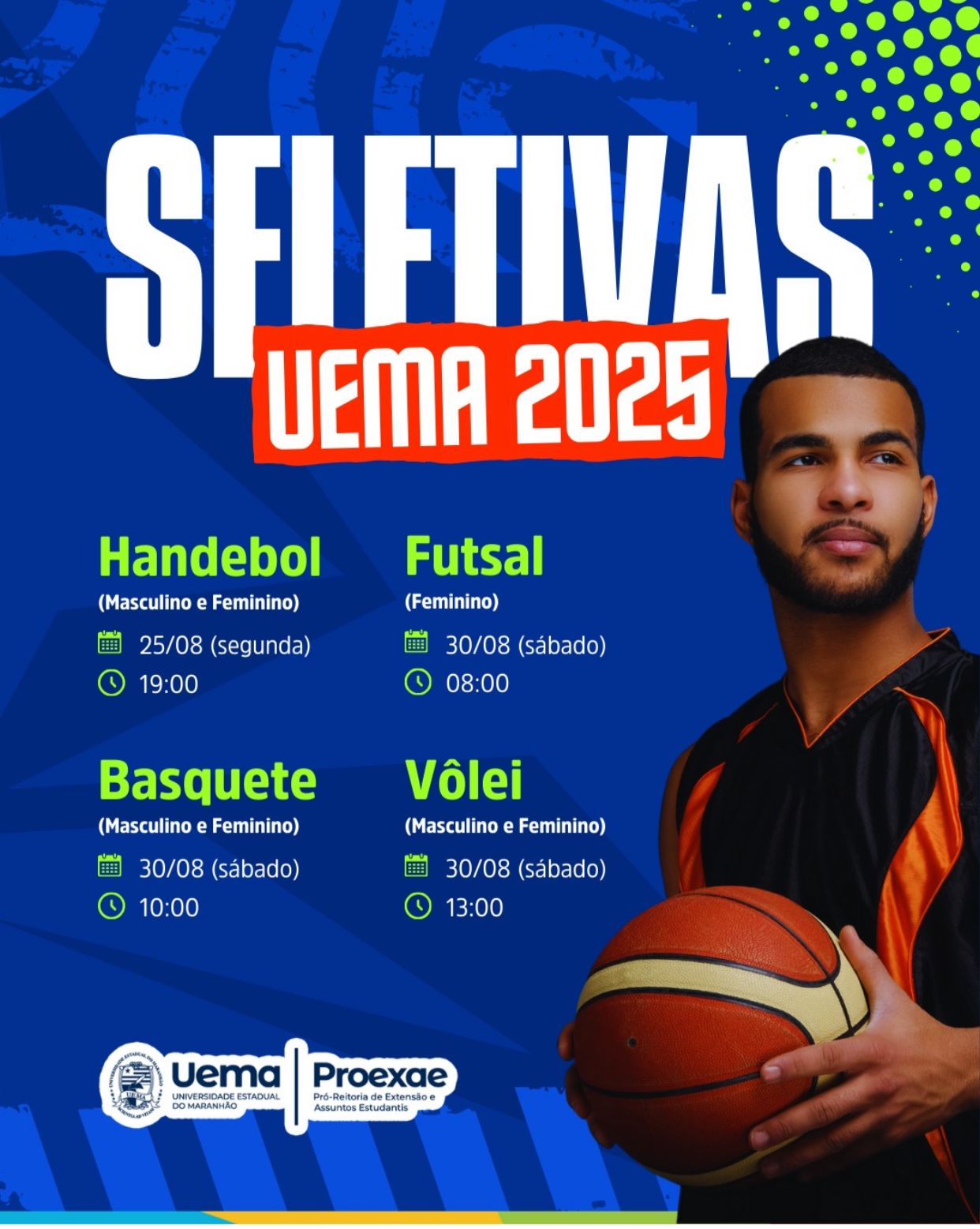 A Universidade Estadual do Maranhão (Uema), por meio da Pró-Reitoria de Extensão e Assuntos Estudantis (Proexae), promove no próximo sábado, 30 de agosto, as Seletivas Uema 2025, no Ginásio Poliesportivo José Nilson Alves Andrade, localizado no Campus Paulo VI, em São Luís.