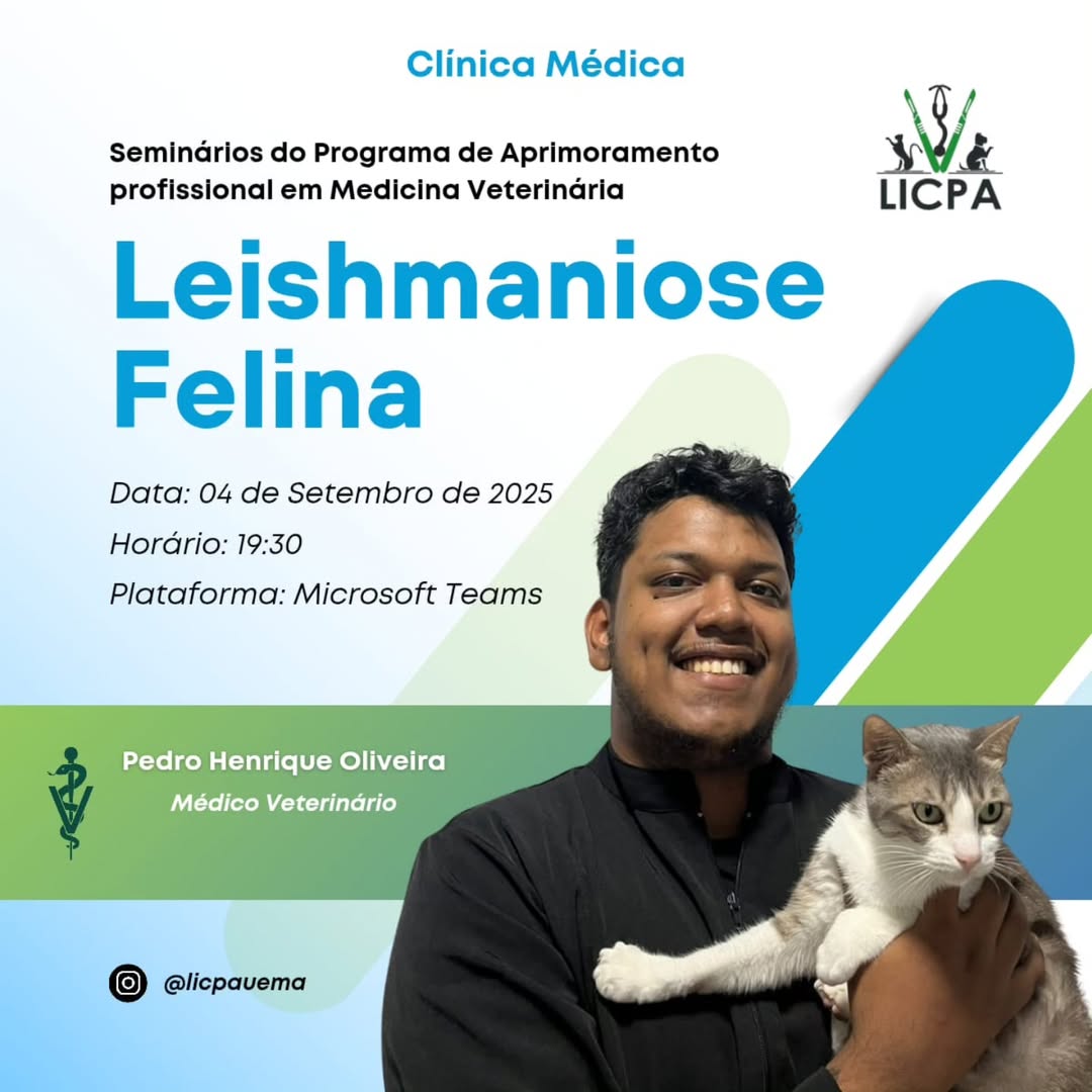 A Universidade Estadual do Maranhão (Uema), por meio da Liga Acadêmica de Clínica Médica, Cirúrgica e Anestesiologia de Pequenos Animais (LICPA) do curso de Medicina Veterinária, vinculada ao Centro de Ciências Agrárias (CCA), realizará nesta quinta-feira (4) um seminário do Programa de Aprimoramento Profissional em Medicina Veterinária (PAMV) sobre Leishmaniose Felina.