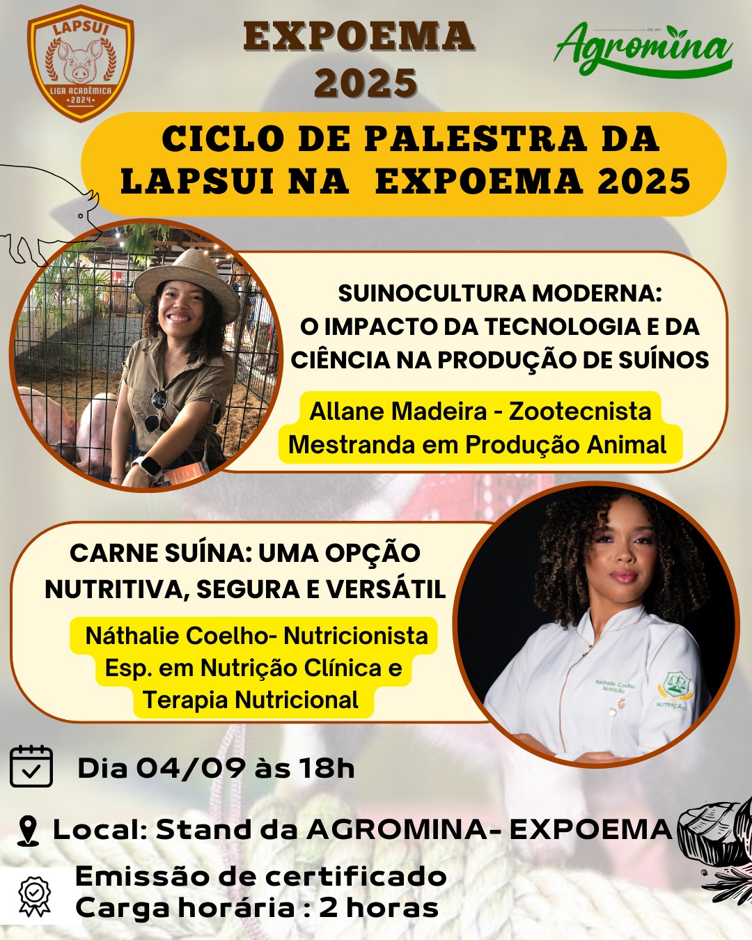 No stand, será realizado na quinta-feira (4), às 18h, um ciclo de palestras com a zootecnista Allane Madeira, sobre o tema “Suinocultura moderna: o impacto da tecnologia e da ciência na produção de suínos”, seguida pela nutricionista Náthalie Coelho, que abordará o tema “Carne suína: uma opção nutritiva, segura e versátil”.