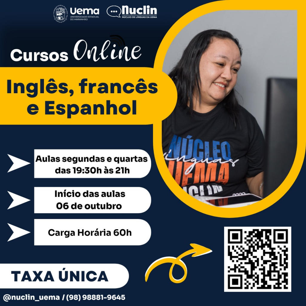 O Núcleo de Línguas da Universidade Estadual do Maranhão (Nuclin/Uema) está com inscrições abertas para novas turmas na modalidade online. Ao todo, estão sendo ofertadas mais de 425 vagas distribuídas entre os cursos de Inglês, Espanhol e Francês, ampliando as oportunidades de aprendizado para a comunidade acadêmica e o público em geral.