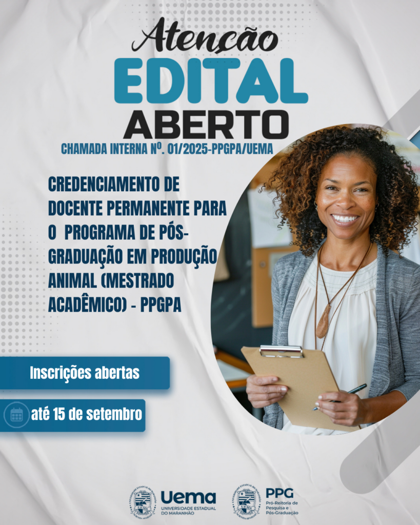 A Universidade Estadual do Maranhão, por meio do Programa de Pós-Graduação em Produção Animal (PPGPA), torna público o período de 1º a 15 de setembro de 2025 para inscrições de candidatura a docente permanente do curso de Mestrado Acadêmico em Produção Animal.
