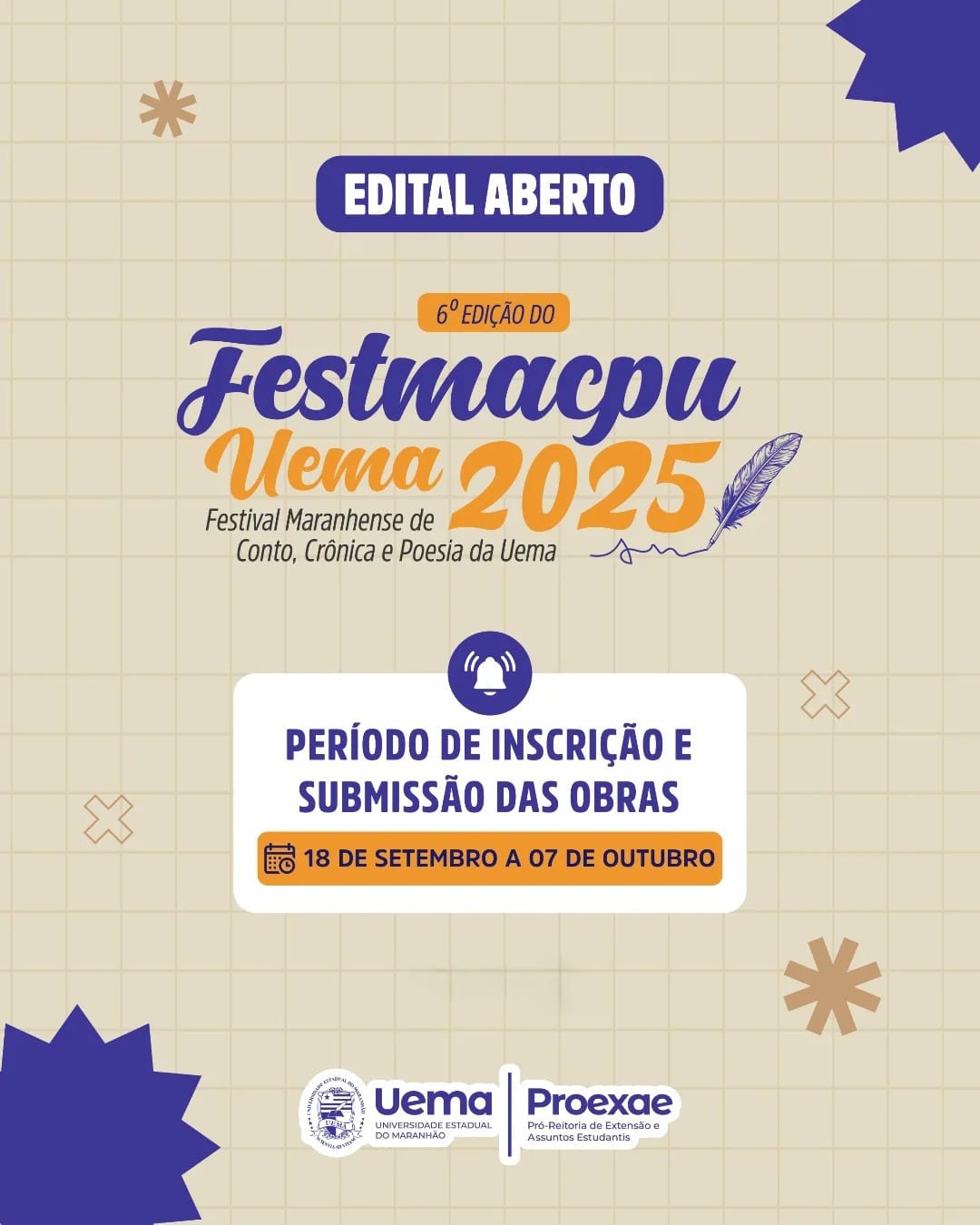 A Universidade Estadual do Maranhão (Uema), por meio da Pró-Reitoria de Extensão e Assuntos Estudantis (Proexae), torna público o edital do 6º Festival Maranhense de Conto, Crônica e Poesia da Uema (FESTMACPU). Nesta edição, o Festival prestará homenagem à escritora Zelinda Lima e ao poeta Ferreira Gullar.