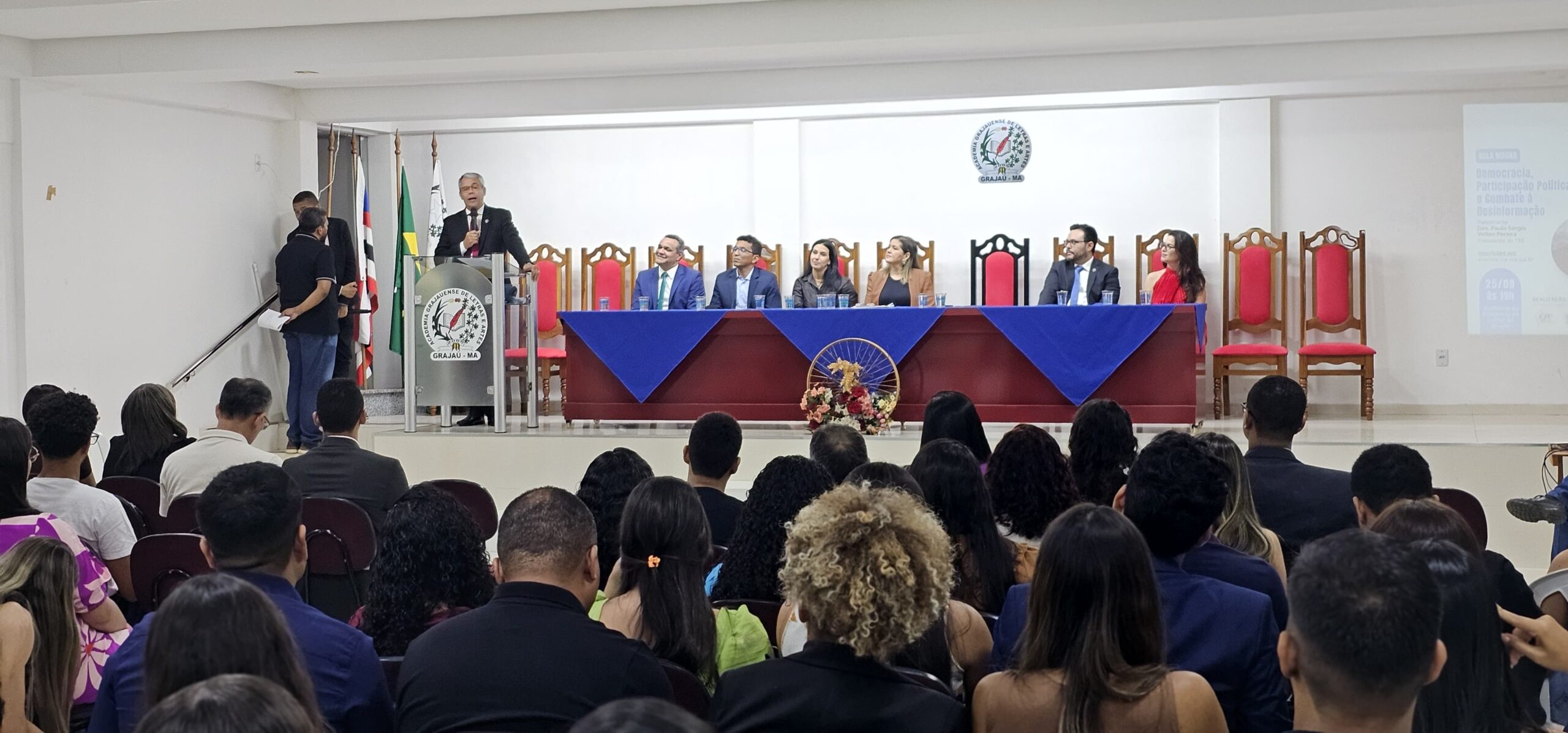 O fortalecimento da democracia e o papel da educação no combate à desinformação foram temas centrais da Aula Magna realizada em Grajaú no último 25 de agosto. O evento foi promovido pelo Curso de Direito da Universidade Estadual do Maranhão (Uema) Campus Grajaú, em parceria com o Tribunal Regional Eleitoral do Maranhão (TRE-MA), e contou com palestra do presidente do TRE-MA, desembargador Paulo Sérgio Velten Pereira.