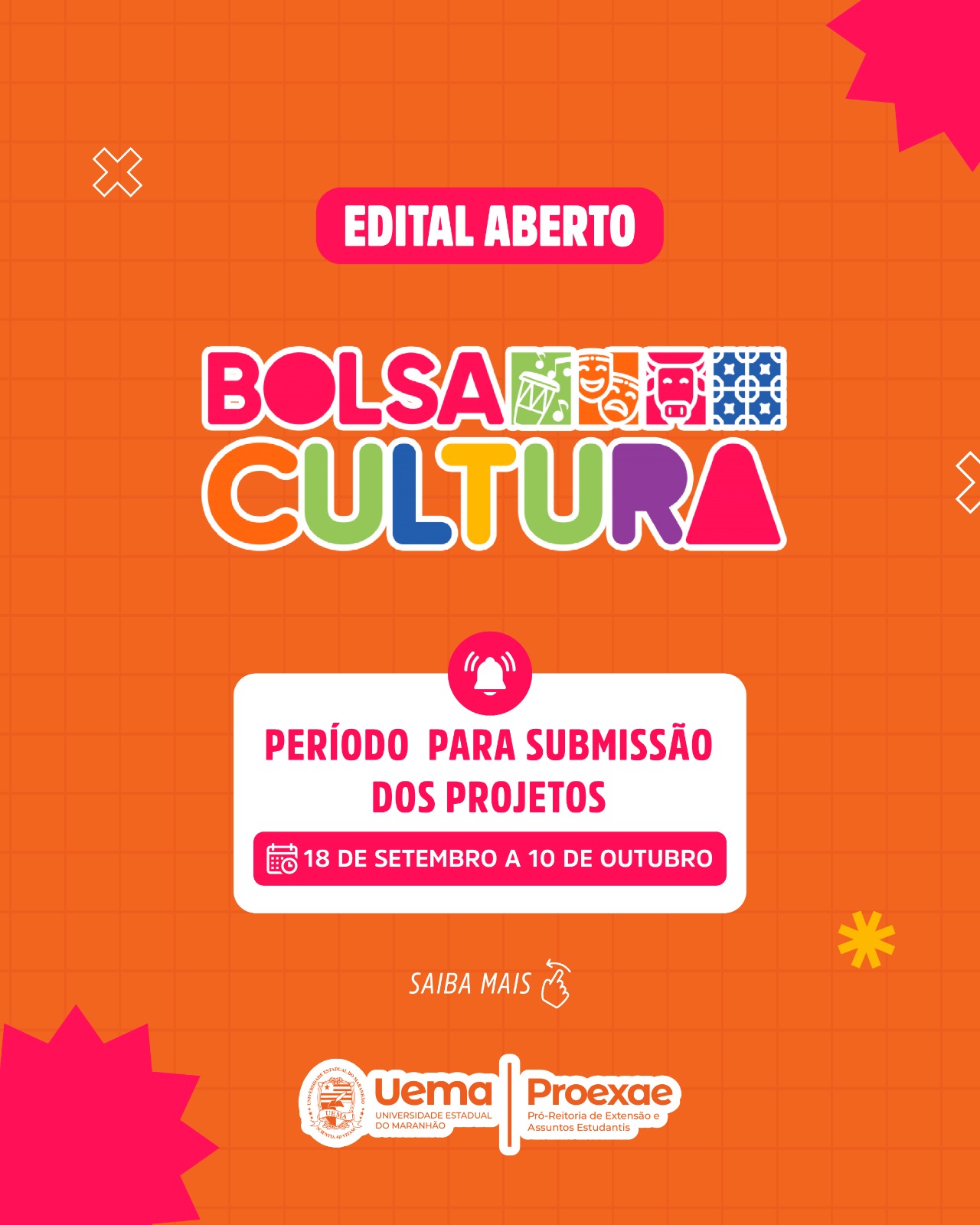A Universidade Estadual do Maranhão (Uema), por meio da Pró-Reitoria de Extensão e Assuntos Estudantis (Proexae), lançou o Edital nº 20/2025 do Programa Bolsa Cultura. Serão oferecidas 60 bolsas de extensão, no valor de R$ 700 cada, com vigência de novembro de 2025 a agosto de 2026.