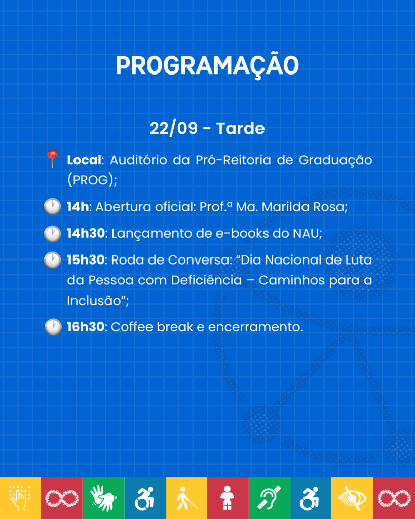 A programação inclui o lançamento de e-books produzidos no âmbito do NAU/Uema, que reúnem experiências e reflexões sobre acessibilidade, além de uma Roda de Conversa com o tema “Dia Nacional de Luta da Pessoa com Deficiência – Caminhos para a Inclusão”. O debate reunirá estudantes, professores e convidados, abordando os desafios e avanços relacionados à inclusão de pessoas com deficiência, como Transtorno do Espectro Autista (TEA), deficiência visual, auditiva e física.