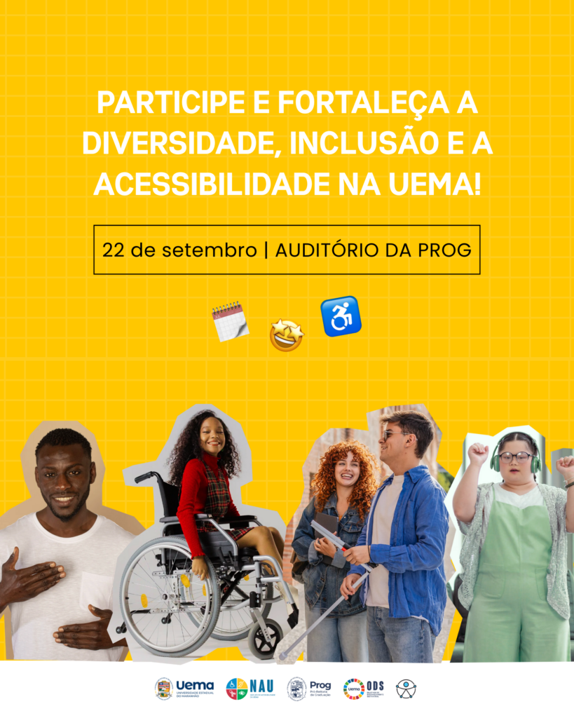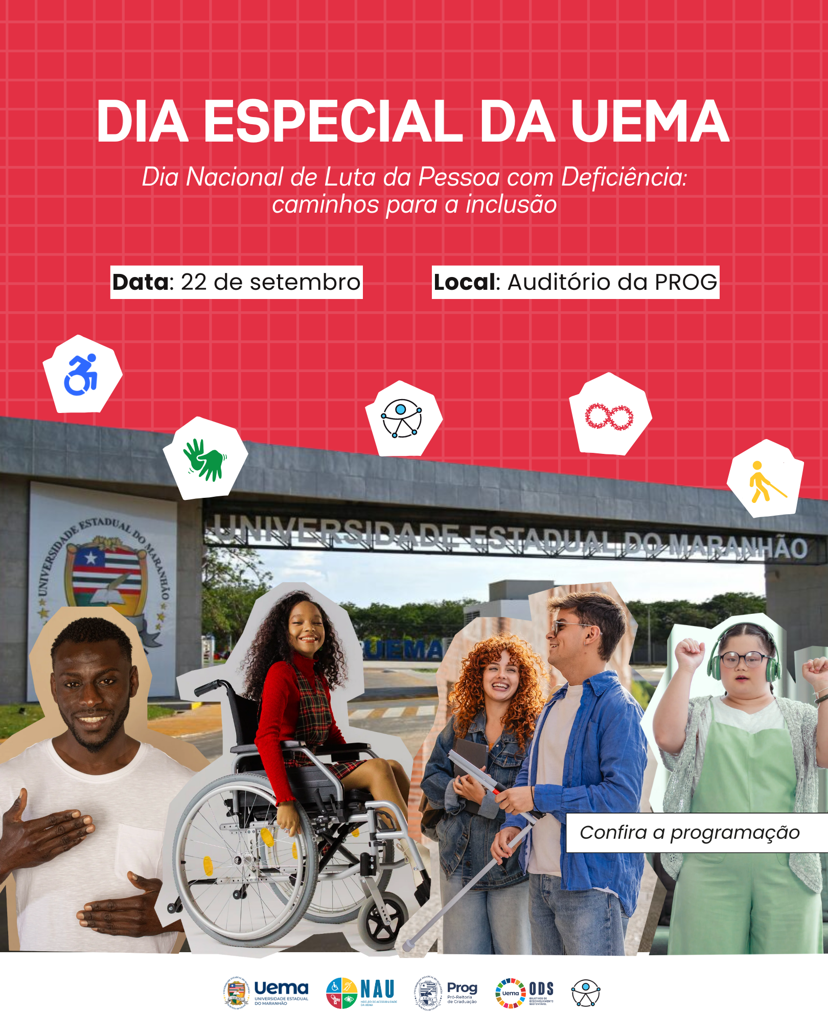 A Universidade Estadual do Maranhão (Uema), por meio do Núcleo de Acessibilidade (NAU), realizará no próximo dia 22 de setembro de 2025, o Dia Especial da Uema, com o tema “Dia Nacional de Luta da Pessoa com Deficiência – Caminhos para a Inclusão”. O evento acontecerá no Auditório da PROG, das 14h às 17h, e é aberto à comunidade acadêmica.