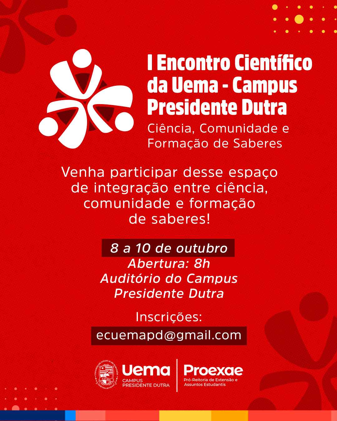 A Universidade Estadual do Maranhão (Uema) por meio do Campus Presidente Dutra, realizará o I Encontro Científico com o tema “Ciência, Comunidade e Formação de Saberes”, fortalecendo a integração entre universidade e comunidade local.