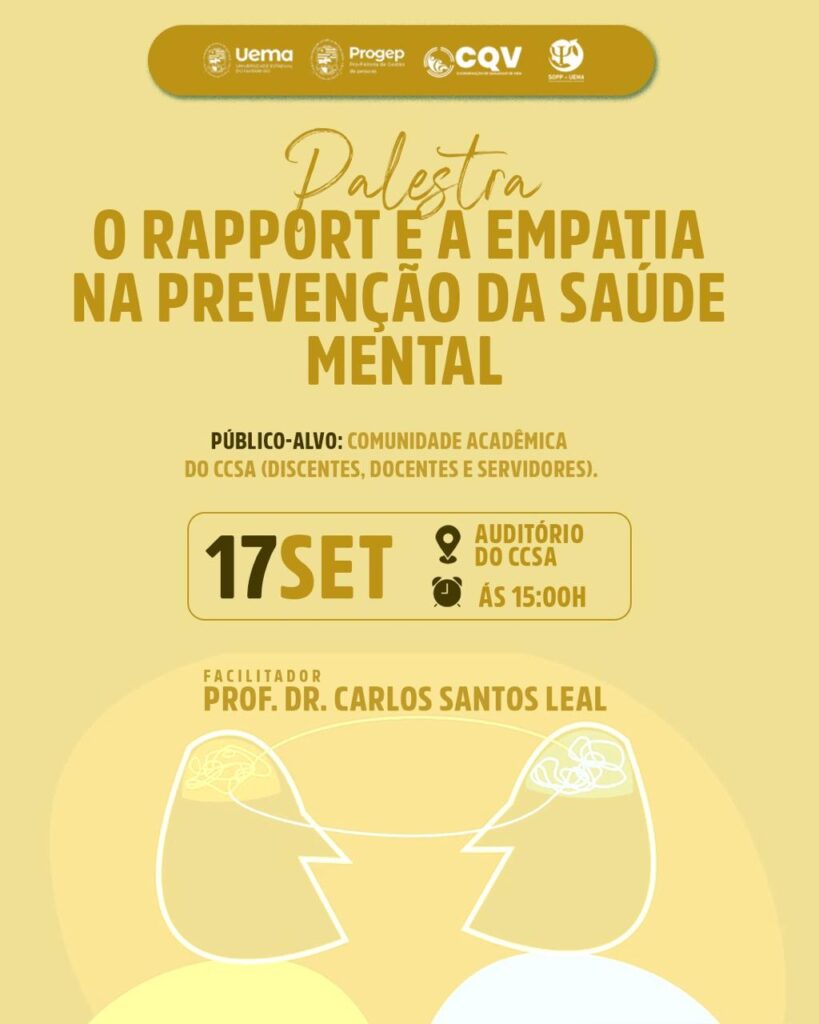 A Universidade Estadual do Maranhão (Uema), por meio da Divisão de Apoio Psicológico da Coordenação de Qualidade de Vida da Pró-Reitoria de Gestão de Pessoas (CQV/Progep), realizará a palestra “O rapport e a empatia na prevenção da saúde mental”, em alusão ao Setembro Amarelo.