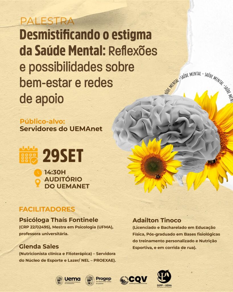 A Universidade Estadual do Maranhão (Uema), por meio da Divisão de Apoio Psicológico da Coordenação de Qualidade de Vida da Pró-Reitoria de Gestão de Pessoas (CQV/Progep), promoverá na próxima segunda-feira (29), a palestra “Desmistificando o estigma da Saúde Mental: reflexões e possibilidades sobre bem-estar e redes de apoio”.