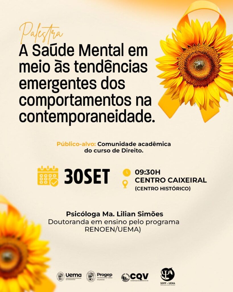 A palestra será conduzida pela psicóloga Lilian Simões, doutoranda em Ensino pelo Programa de Pós-Graduação em Rede Nacional (Renoen/Uema), que trará reflexões sobre o cenário contemporâneo e suas implicações para o bem-estar psicológico.