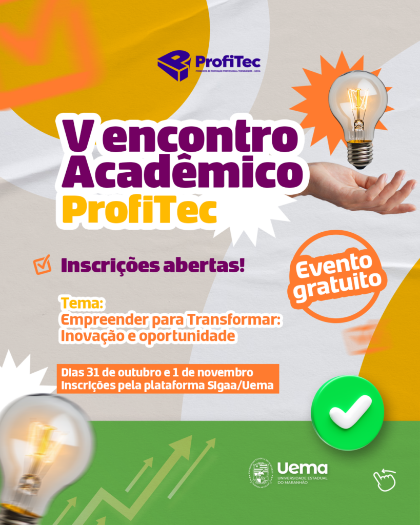 A Universidade Estadual do Maranhão (Uema) realizará, nos dias 31 de outubro e 1º de novembro de 2025, o V Encontro Acadêmico ProfiTec, com o tema “Empreender para Transformar: Inovação e Oportunidade”.