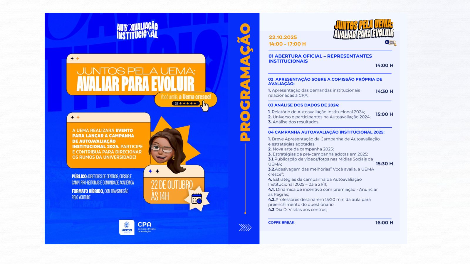 Com o objetivo de fortalecer a cultura avaliativa e ampliar a participação da comunidade acadêmica, a Universidade Estadual do Maranhão (Uema), por meio da Comissão Própria de Avaliação (CPA), realiza no dia 22 de outubro, às 14h, o evento “Juntos pela Uema: Avaliar para Evoluir”. O encontro acontecerá de forma híbrida, com transmissão pelo YouTube e participação presencial no auditório da UemaNet em São Luís.